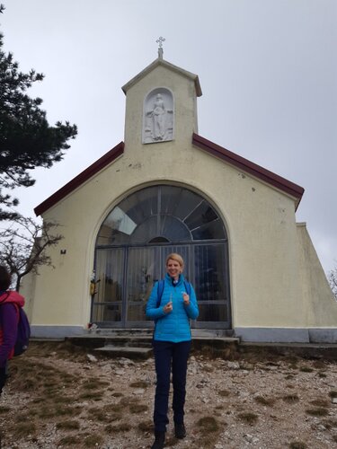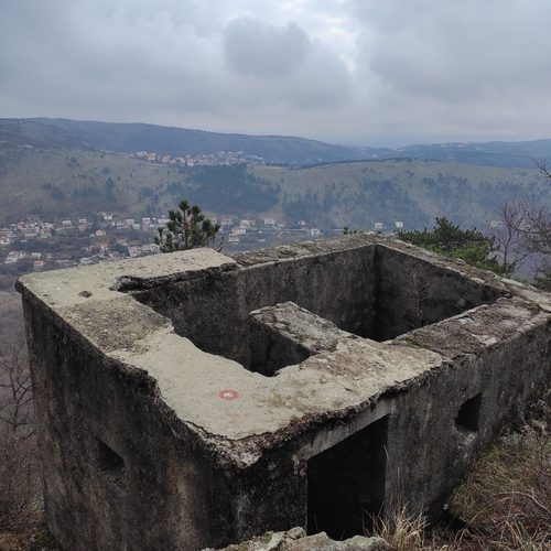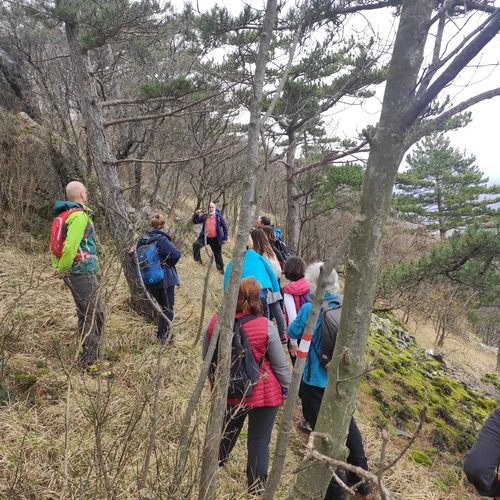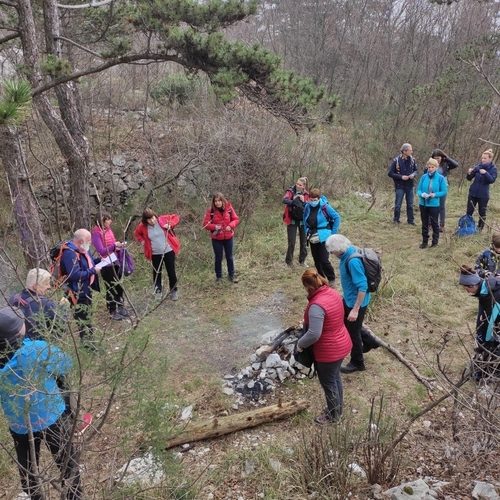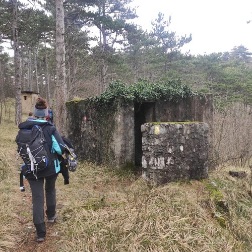 Da je vedrijeg vremena vidjeli bi i grobničke Alpe, ali ne možemo imati baš sve. 🙂 Duž većeg dijela staze vidimo ostatke vojnih obrambenih utvrda, a glavnim dijelom puta prolazimo i oko obrambene utvrde Katarina B u koju ćemo nešto kasnije i ući. Vidimo duž puta otvore utvrde, dobro skrivene, koji bi možda nepažljivom prolazniku mogli promaknuti. Nekima od nas umalo i jesu. 🙂 Staza je dobro označena planinarskim markacijama kao i markacijama riječkih šetnica, ali mi smo se naravno pouzdali u našeg vodiča.